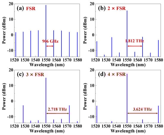 (a) Initial comb in C-band from 1520 nm to 1582 nm through micro-comb resonator ( GHz). (b) Filtered comb with double repetition frequency (2 × THz). (c) Filtered comb with triple repetition frequency (3 × THz). (d) Filtered comb with quadruple repetition frequency (4 × THz).