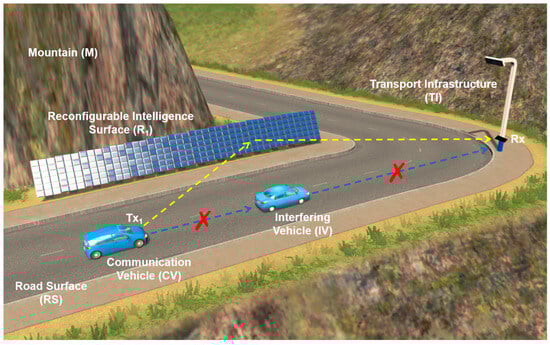 - In order to solve the problem of the LOS link blockage caused by the mobility of vehicles in V2I–VLC systems, an optical RIS-based V2I–VLC transmission scheme is proposed. It should be noted that the interfering vehicle (IV) is located between the communication vehicle (CV) and the transportation infrastructure (TI).