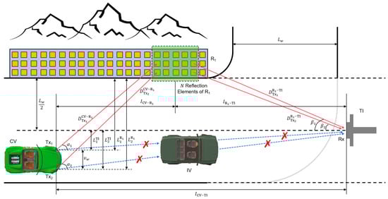 Let represent the path loss of the CV––TI communication link corresponding to the Tx and formed by the reflection of the element. Thus, the real-valued channel coefficients of the link can be expressed as :