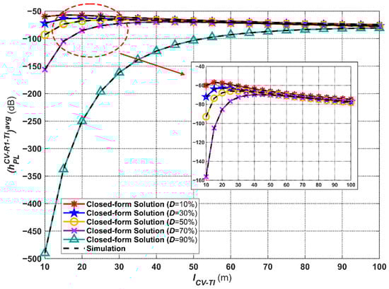 Finally, according to Equations (18) and (20), a closed-form expression for the average path loss of the CV– link corresponding to can be obtained as: