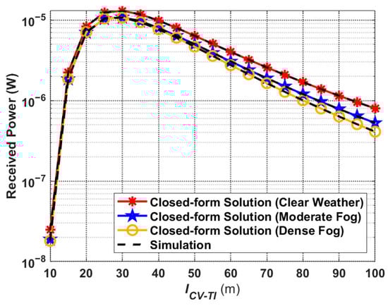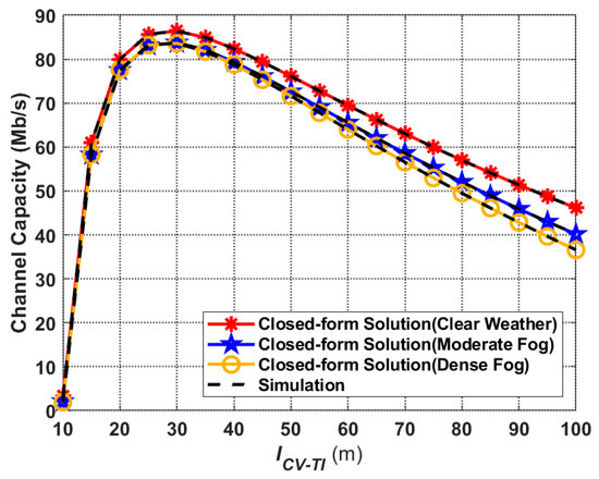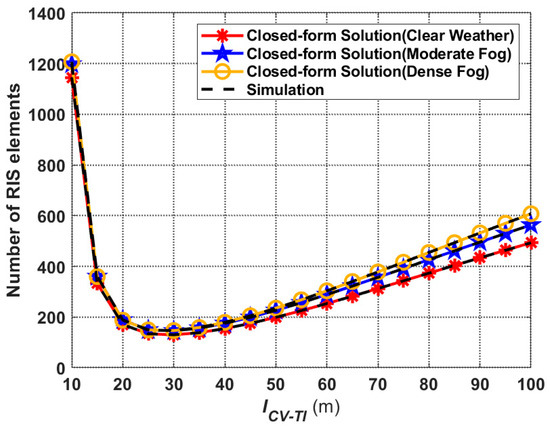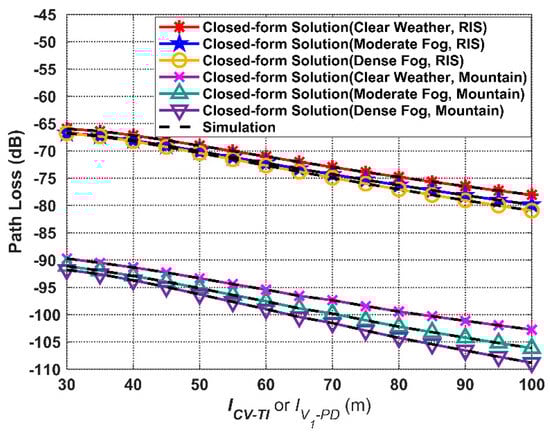 In summary, for the overall CV––TI link, since , a closed-form expression for the average path loss of the proposed RIS-aided V2I–VLC system can be calculated as: