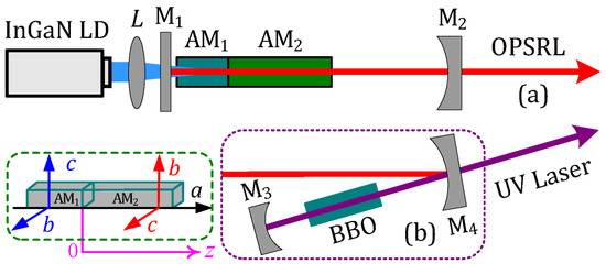 The schematic setup of the OPSRL at 698 nm is shown in Figure 2. The pumping source was an InGaN LD (LSR444SD, Laser Components), providing a linearly polarized beam at 444 nm and a maximum output power of 20 W with a beam quality factor (M2) of 46. To make the absorption of the two laser crystals more balanced, the polarized direction of the pump beam was at a 45° angle to the c-axis of both laser crystals. A lens (L) of 50 mm focal length with anti-reflection (AR) at 444 nm focused the collimated pump beam onto the active media. A plane mirror was utilized as the input coupler of the resonator (M1), which was AR-coated at 444, 600–650, and 721 nm, with high reflectivity (HR) at 698 and 349 nm. The active medium was a combination of two a-cut and 0.1% doped Pr:LLF crystals (AM1 and AM2), which was AR-coated at 349, 444, and 698 nm. The lengths of AM1 and AM2 were 4 mm and 10 mm, respectively, and both featured a 3 × 3 mm2 cross-section. The gap between AM1 and AM2 was approximately 0.1 mm. Both active media were encapsulated in indium foil and installed on a 15° water-cooled copper radiator. The c-axes of AM1 and AM2 were perpendicular to each other, so the π-polarized emissions at 698 nm produced by the two active media were orthogonal. A plano-concave output coupler (M2, radius of curvature = −500 mm) was AR-coated for 600–650 nm and 721 nm, with a transmittance of 3.2% at 698 nm. Output couplers with 1.5%, 3.2% (M2) and 5.0% transmittance were utilized, and M2 yielded optimal laser output.