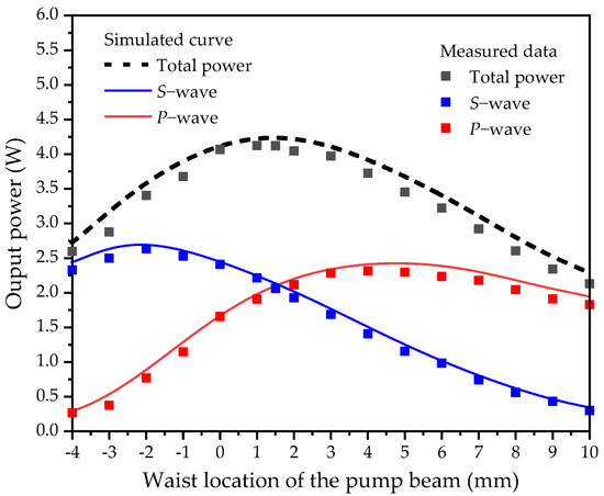 where ηi is the quantum efficiency and hνp is the energy of the pump photon. With Equations (1)–(4) and the parameters in the experiment—Toc = 0.035, hνi = 2.87 × 10−19 J, σi = 5.0 × 10−20 cm2, l1 = 5 mm, l2 = 12 mm, Li = 0.6%, τi = 37.9 μs, ξi = 36.4%, P = 20 W, αi = 1.44 cm−1, λp = 444.2 nm, M2 = 46, ni = 1.45, ωp0 = 200 μm, ηi = 0.64, hνp = 4.51 × 10−19 J, and Ni = 1.44 × 1019/cm3—the output powers of the two polarized components were calculated as a function of the waist location of the pump beam, as shown in Figure 3. It can be observed in Figure 3 that the power of the S-polarized component first increased monotonically with the waist location of the pump beam, reaching its maximum at z = −2.0 mm, and then decreased monotonically. On the other hand, the power of the P-polarized component increased monotonically with the waist location of the pump beam, peaking at z = 5.0 mm before monotonically decreasing. It was also found that an intersection point existed between the two curves, indicating that at z = 1.5 mm, the output power of the two components reached equilibrium. It should be noted that the total output power reached its maximum when the power levels of the two polarized components were approximately equal. The movement of the pump beam waist in either direction from this point resulted in a gradual decrease in total output power, since optimal excitation of the two active media occurred exclusively at this location. At other locations, only one active medium was efficiently excited for lasing.