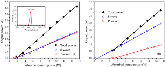 Figure 4 shows the experimentally obtained output power of the OPSRL against the waist location of the pump beam under a pump power of 20 W. The absorption efficiency of AM1 was 43.8%, resulting in an absorption of 8.8 W. The remaining power of 11.2 W was absorbed by AM2, with an absorption efficiency of 76.3%, yielding an absorption of 8.5 W. A peak total power output of 4.12 W was produced at z = 1.5 mm, with each polarized component measured at 2.06 W, yielding a total optical conversion efficiency of 23.8% relative to the absorbed power. The measured experimental data were in good agreement with the theoretical fitting curve in Figure 3. The output powers of the two polarized components versus the absorbed pump power for different waist locations of the pump beam were studied, as shown in Figure 4. The OPSRL was separated using a polarization beam splitter, and the output power of each polarized component was measured separately. Figure 4a shows the output powers of the two polarized components versus the absorbed pump power at z = 1.5 mm. The experimental data indicated that the output powers of P- and S-waves remained relatively close across all pump power levels. This phenomenon was attributed to the two active media reaching nearly identical excitation levels. At an absorbed pump power of 17.3 W, the total output powers of the two polarized components reached 4.12 W with a corresponding total slope efficiency of 26.9% with respect to the absorbed pump power. The laser spectrum of the OPSRL was measured using a spectrum analyzer with a resolution of 0.01 nm (Ocean Optics, HR2, Orlando, FL, USA), as shown in the inset of Figure 4a. The linewidth was 0.33 nm (FWHM) with a peak wavelength of 698.4 nm.