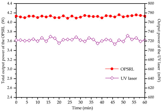 The total power stability of the OPSRL was measured with a power meter (FieldMate, Coherent Inc., Saxonburg, PA, USA) at maximum output power, exhibiting a fluctuation of less than 2.8% (RMS) over a one-hour period, as shown in Figure 5. The X- and Y-axis beam radii of the OPSRL were measured, as shown in Figure 6. The M2 factors of the OPSRL were measured, yielding and . The OPSRL profile is also shown in the inset of Figure 6, which is nearly distributed as a Gaussian function. Figure 4b shows the output characteristics of the two polarized components at z = −2.0 mm. It can be seen that the threshold power of the P-wave exceeds 4.5 W, and its slope efficiency is significantly lower compared to the S-wave. A balance between the two polarized components could not be achieved at any pump power level. This was because only AM1 had been efficiently excited at z = −2.0 mm. At an absorbed pump power of 17.3 W, the total output powers of the two polarized components reached 3.40 W (2.46 W at S-wave and 0.94 W at P-wave) with a corresponding total slope efficiency of 23.9% with respect to the absorbed pump power. Although the power output of the two polarized components cannot be balanced at any pump power, it can achieve a larger power ratio. The M2 factors of the S- and P-waves, measured via the knife-edge technique at maximum output power, were 1.16 and 1.21, respectively.
