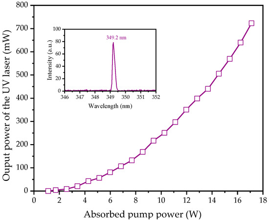 A folded V-shaped resonator was employed to achieve an efficient UV SFG, illustrated in Figure 2b. The pump source, input coupler (M1), and active media (AM1 and AM2) are the same as those in Figure 2a. To ensure uniform excitation across both active media, the waist location of the pump beam was set at z = 1.5 mm. The completely reflecting reflector (M3) was a concave mirror with a −200 radius of curvature, which was coated with HR at 698 and 349 nm, and AR at 600–650 and 721 nm. The UV output coupler (M4) was a concave mirror with a -50 radius of curvature, which was coated with HR at 698 nm and AR at 349, 600–650, and 721 nm. A type-II CPM cut BBO crystal (θ = 49.7° with deff = 0.835 pm/V) served as the SHG crystal. The UV output performance is shown in Figure 7. The maximum UV power reached 723 mW with a threshold of 1.12 W. The UV laser spectrum at 349 nm is shown in the inset of Figure 7. The linewidth was 0.28 nm with a peak wavelength of 349.2 nm. The UV power stability was 2.1% (Figure 5). The UV laser beam radii along the X- and Y-axes versus the transmission distance are shown in Figure 8. The M2 factors in the two directions were 1.22 (X-axis) and 1.31 (Y-axis), respectively. The profile of the UV beam is also shown in the inset of Figure 8. The spectrum of the UV laser at the maximum pump power is shown in the inset of Figure 6. The linewidth was 0.25 nm with a peak wavelength of 349.2 nm.