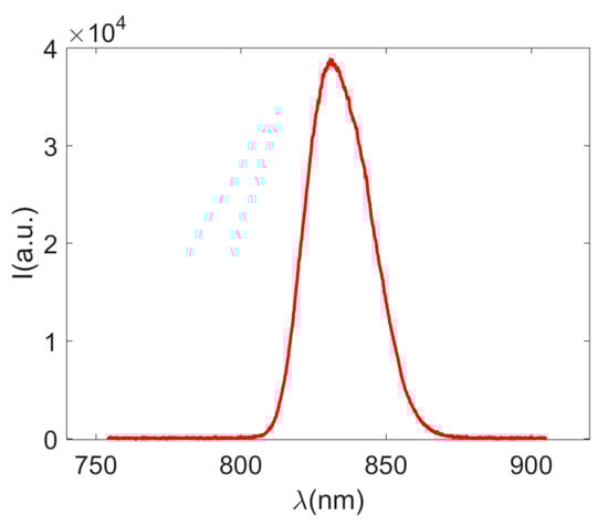 A 12 mW super-luminescent diode (SLD, EXS210005-02; EXALOS, Schlieren, Switzerland) with a Gaussian-shaped emission spectrum centered at (Figure 3) and a full width at half maximum (FWHM) of is selected as the coherent light source.