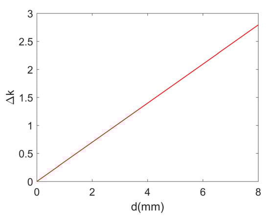 The measured plasma density within the hole represents a localized value of approximately 6.9 × 1021 m−3. Obtaining the vertical density profile proves challenging due to experimental constraints. Based on pressure equilibrium considerations within the hole, we adopt a uniform plasma distribution assumption for simplification. Incorporating all relevant constants and parameters into the governing equations yields the plasma-induced optical path length correction term Δk, as illustrated in Figure 5. This linear relationship can be mathematically expressed as Δk = 0.349d, where d denotes the instantaneous hole depth in millimeters and Δk is expressed in wavenumber units. This analysis reveals that when the hole depth reaches 1/0.349 ≈ 2.9 mm, the optical path discrepancy accumulates to one wavelength (830 nm).