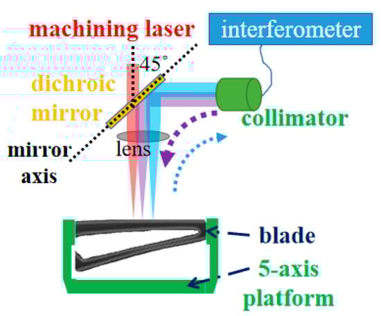 A high-precision kinematic mirror mount system achieves critical alignment through three-axis positional adjustment of the dichroic mirror and two-axis angular alignment to maintain 45° incidence relative to the machining beam (denoted by black dotted line). Another mirror mount system is utilized to optimize the collimator for parallel beam output. The blade specimen (1 mm single-wall thickness) is secured on a five-axis positioning stage at the focal plane of the machining lens assembly.