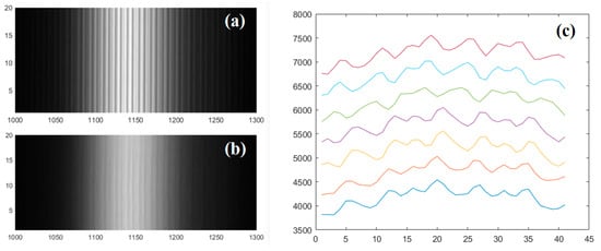 Prior to machining operations, the diagnostic system undergoes precise calibration, enabling the line-scan camera to capture clear and coherent interference fringe patterns as demonstrated in Figure 8a. In this schematic representation, the abscissa corresponds to the one-dimensional intensity distribution of interference fringes captured by the line-scan camera and the ordinate represents the temporal sequence of fringe patterns. The temporal interval between adjacent fringes is governed by the camera’s row acquisition frequency, .