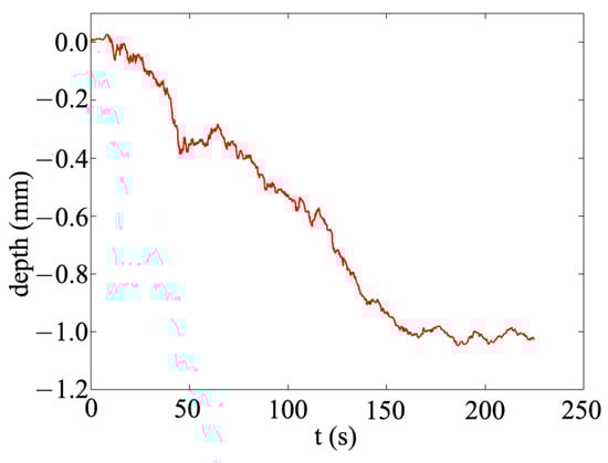 Figure 9 illustrates the evolution of hole depth monitored by the real-time inline coherent imaging diagnostic system. In this experimental configuration, the super-luminescent diode in the diagnostic apparatus remains continuously operational while the line-scan camera is synchronized through the CHE control software. Following a stabilization period of several seconds after camera activation, the machining laser is initiated. The ablation process demonstrates progressive deepening of the hole over time, as evidenced by the continuously updated negative depth values measured through the diagnostic system and computed in real-time by the CHE platform.