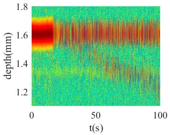 The inherent complexities of femtosecond drilling operations—characterized by irregular hole morphology and the inevitable formation of light-absorbent recast layers—can significantly degrade surface reflectivity. This reduction (quantified at ~0.20 in Figure 9) manifests as image degradation in coherent imaging, potentially leading to complete diagnostic failure in extreme cases. Figure 8b illustrates progressive image blurring during drilling operations, while Figure 11 presents a more severe scenario observed in aluminum alloy processing. The temporal image series reveals a faint negative-slope linear feature emerging at laser activation (), representing time-resolved coherent images with critically low reflectance.