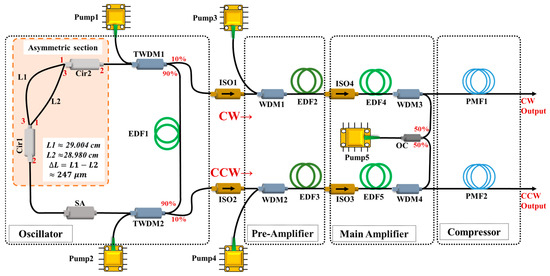 The pre-amplified counter-propagating pulses were subsequently routed to the main amplifier stage, where a 0.6 m anomalous-dispersion erbium-doped fiber (D = +16.6 ps/(nm·km), Nufern:PM-ESF-7/125, Nufern, East Granby, CT, USA) underwent backward pumping via Pump5 through wavelength-division multiplexers (WDM3 and WDM4, MC: MCPMWDM-9855-00-P9-10-B-N, Mingchuang, Shenzhen, China). This staged amplification architecture achieves nonlinear power scaling while maintaining controlled dispersion evolution through engineered β2(z) management governed by