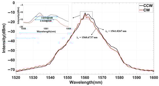 The dual-pumped laser architecture achieves robust bidirectional mode-locking operation through independent pump power regulation at Ppump1 = 530 ± 5 mW and Ppump2 = 670 ± 7 mW. The bidirectional output channels demonstrate PCW = 7.37 mW (clockwise) and PCCW = 9.18 mW (counterclockwise). Direction-resolved spectral characterization using an optical spectrum analyzer (0.02 nm resolution) revealed distinct propagation-dependent spectral fingerprints (Figure 2):
