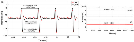 The 953 ± 5 pm wavelength separation with 7.8% spectral overlap demonstrates effective direction-division multiplexing (Table 1). The spectral envelopes in both directions exhibit near-Gaussian profiles, indicating that the bidirectional mode-locked solitons are of breathing type. A discernible discrepancy in spectral linewidths emerges owing to the inherent asymmetry of bidirectional mode locking. Figure 3 presents the temporal characterization results of the bidirectional emissions. The output pulses from both propagation directions were monitored using high-bandwidth photodetectors (BRF = 2 GHz) and subsequently analyzed using a microwave frequency counter (δf = 1 Hz). Both channels maintained a fundamental harmonic mode-locking operation with repetition rates of fCCW = 64.6391 MHz (counterclockwise) and fCW = 64.6339 MHz (clockwise) with remarkable power stability (Figure 3a), exhibiting less than 0.5% relative fluctuation over 120 min continuous operation (Figure 3b). Notably, bidirectional solitons that share a common saturable absorber exhibit no detectable self-synchronization. This absence of synchronization likely arises from the temporal asynchrony between the counter-propagating pulse trains, wherein soliton collisions occur stochastically across the entire cavity with prolonged periodicities. The lack of persistent positive feedback mechanisms fundamentally precludes the stabilization of synchronized states.