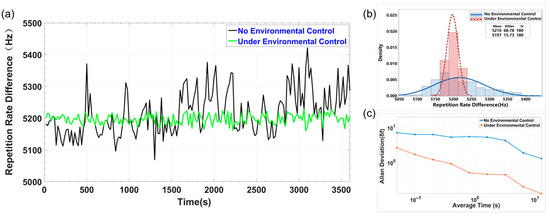 (a) Comparison of bidirectional repetitive rate difference fluctuations with and under environmental control. (b) Repetition rate difference distribution: blue solid line (uncontrolled) and red dashed line (controlled). (c) Allan variance analysis of repetition rate deviations.