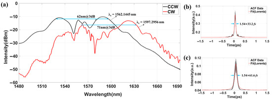 (a) Bidirectional output spectrum after power amplification and pulse compression; (b) autocorrelation curve of CW output; (c) autocorrelation curve of CCW output.