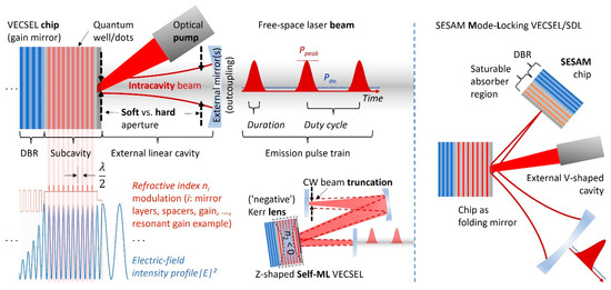 - Rahimi-Iman, A. Self-mode-locked vertical-external-cavity surface-emitting laser, Chap. 12. In Vertical External Cavity Surface Emitting Lasers: VECSEL Technology and Applications; Jetter, M., Michler, P., Eds.; Wiley-VCH: Weinheim, Germany, 2021; ISBN 978-3527413621. [Google Scholar] [CrossRef]