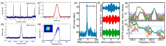In brief, recent advances in VECSEL technology clearly indicate new trends such as self-starting ultrashort-pulse or self-starting optical-comb generation [5,30,35] and their potential for applications in spectroscopy, sensing and metrology [44,45]. Figure 2a–g show experimental signatures of SML-based sub-ps pulsing from a quantum-dot VECSEL [26] and FM-comb formation in a quantum-well VECSEL [30], respectively.