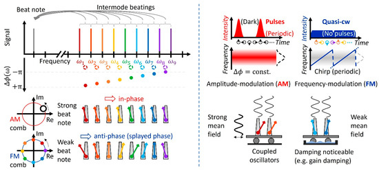 Figure 3 represents a schematic comparison of the two synchronization states for the oscillating laser modes. To be more specific, the one state attributed to AM comb formation is the “in-phase” state, the other state related to FM combs is referred to as the “splayed phase” (or antiphase) state. The former type yields a strong mean field because intermode beat notes can have the same phase, whereas the latter exhibits phases between the intermode beat notes across the laser spectrum spanning a range from 0 to 2π, with a weak mean field [51]. In other words, such antiphase states feature for each intermode beat note another one that is π out of phase with it (see bottom left diagram in Figure 3). Corresponding FM-comp emission was reported in various types of (free-running) semiconductor lasers, with both interband laser transitions [30,51,52,53], including cascaded [54], and intraband (quantum) cascaded [55,56,57]. A detailed discussion of quasi-cw FM-type and pulsed AM-type frequency combs (cf. Figure 3) can be found for instance in ref. [51]. It is noteworthy that FM mode-locking is, however, not a new phenomenon and was discussed in the past also for solid state lasers [58].