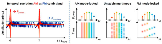 Figure 4 furthermore indicates the difference in temporal evolution between an amplitude-modulated (AM) and FM comb signal. The example time trace for the stable AM comb as well as instable multimode output on the right side of Figure 4 is sketched after recorded traces for a VECSEL in a Streak-camera experiment in ref. [35]. An additional diagram for the FM comb indicates the periodic sweep in the instantaneous frequency (the single mode of the multimode system “on”, i.e., emitting, at the given-time)—like in a traffic light. Apparently, it would be a highlight to obtain experimental demonstrations of such a time-dependent emission signature of the FM-comb state with a system capable of resolving such a temporal and spectral pattern (spatially on a detector screen with time-tagged events, such as with a Streak camera system).