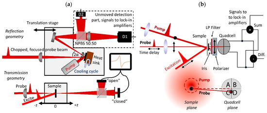 (a) Sketch of a typical Z-scan apparatus used for characterizing a gain mirror chip (upper part) and gain membrane chip (lower part) in reflection and transmission geometry, respectively (cf. refs. [40,64]). A normalized transmission Z-scan trace (from time-integrated acquisition) as a result of combining “open” and “closed” detector signals for a given probe fluence setting is sketched—here for a negative n2. For the investigation of a nonlinear lensing effect in a VECSEL chip (“black box” effective n2, similarly effective nonlinear absorption), the sample is step-wise displaced in z-direction along the optical axis (irradiance with ~0.1 ps probe pulses, with Gaussian beam profile) to obtain the typical beam transmission variations as a function of the z position. For opaque chip structures, as is the case for most VECSELs, the incident and reflected beam part defines a small opening angle (2α), which can be varied to tune the microcavity properties (cf. ref. [39]). Optional cw optical pumping similar to laser operation conditions, or a pulsed excitation of free-charge carriers, can be applied to study their role in the effective n2. (b) Schematic drawing of an ultrafast beam deflection setup for the direct measurement of the Kerr nonlinearity and gain dynamics on sub-ps time scales (cf. ref. [40]). The probe beam spot located on the falling slope of the Gaussian pump irradiance gradient will experience a nonlinearity-dependent deflection, which is detected with the help of a quadcell photodetector—with temporal features of the transmission accessible through time delay settings. Author drawings after the respective literature examples.