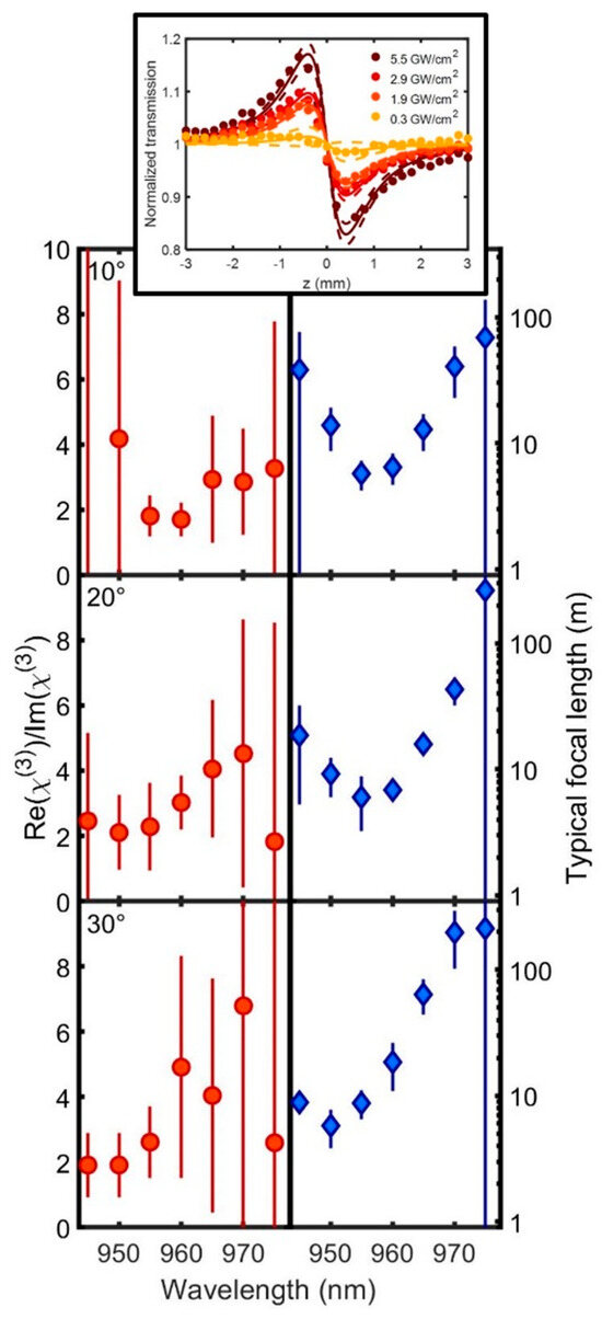 Spectrally resolved typical nonlinear lensing strength in the vicinity of the VECSEL operation wavelength for three on-chip incidence angles, as deduced from experimental data in ref. [39] (see right axis). The ratio of the real and imaginary part of the measured third-order nonlinearity χ(3) is displayed (see left side) with error bars according to the limited precision in nonlinear absorption and refraction determination as depicted in Figure 4 of the original publication. Reused with permission from the Optical Society of America OPTICA© 2021 [39]. Inset: Four recorded Z-scan traces (data points) with indicated upper/lower bounds (dashed lines) for increasing probe beam irradiances (peak intensity levels), from yellow to red colored [39]; reused with permission from the Optical Society of America OPTICA© 2019.