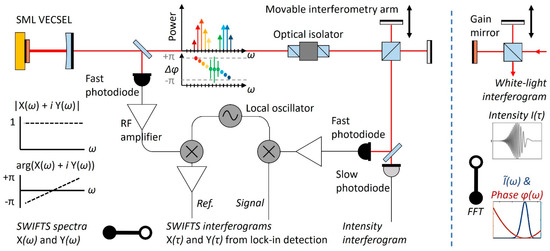 SWIFTS is a technique which allows the measuring of the intermode phase relation of a laser without requiring high peak powers and can reveal the coherence within the laser spectrum (or parts thereof) [66]. It rendered itself well suited for the characterization of laser sources with GHz repetition rates and FM comb emission, or with long pulses. It is a coherent beat-note spectroscopy technique previously employed to investigate comb states in quantum-cascade lasers (see ref. [66]). While it could also be theoretically used to measure the pulse width and chirp of ultrashort pulses, the Signal-to-Noise Ratio (SNR) of the measurement according to ref. [67] would usually shrink a lot for very short pulse lengths (<1 ps) and for relatively low repetition rates, e.g., of the order of MHz. For (S)ML VECSELs with pulse durations above ps and repetition rates above 500 MHz, the SWIFTS technique may actually offer an alternative versatile means of emission characterization, including the probing of phase stability (coherence) over the laser spectrum. Otherwise, pulse characterization typically relies on a sufficient second-harmonic signal in intensity-autocorrelation-type experiments. Particularly linear cavities with their commonly shorter resonators and typically GHz repetition rates could be used in combination with chirped out-coupling mirrors for GDD compensation for stable pulsed or FM-comb emission, which would be analyzable with SWIFTS. For the FM comb state, an intermode phase spanning 2π over the whole laser spectrum is a characteristic result obtained from the phase-sensitive SWIFTS measurements of such mode-locked laser’s emission. Self-starting FM-comb operation of a VECSEL was demonstrated accordingly [30]. Figure 7 shows a schematic drawing of the experiment.