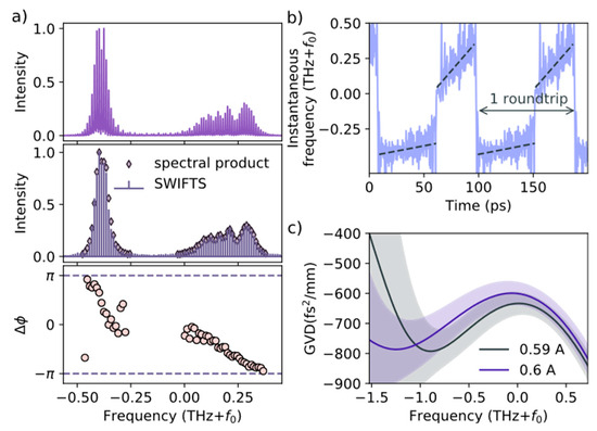 While for or QCLs and diode lasers, the FM-comb state appears as a fundamental operation regime utilizable for applications such as dual comb spectroscopy [51,71], the possibility to yield high-power, compact dual comb sources based on FM-comb VECSELs, where the device could deliver high-power comb lines in a frequency-sweeping quasi-cw regime to the experiment, and where the wavelength could be designed by semiconductor technology, is attractive. However, spectrally dependent dispersion has been identified to be detrimental for comb performance and leads to a decreased comb bandwidth and the appearance of spectral holes [72]: It is deemed responsible for nonuniform comb spectra, nonlinear frequency chirp, and spectral narrowing. To overcome such limitations for FM-comb deployment to applications, accordingly, compensation of higher-order dispersion in the VECSEL chip may become an essential aspect for the design optimization towards improving FM comb operation. An experimental study by Opačak and coworkers [72] on the impact of group velocity dispersion (GVD, equals GDD per unit length) for a semiconductor laser platform with FM-comb emission is summarized in Figure 8. Accordingly, such wavelength-dependent dispersion in the optical system (e.g., the VECSEL chip’s GDD, also known as second-order dispersion) could cause the observation of imperfect combs, e.g., with a split emission spectrum, or partial coherence, such as discussed in the literature (cf. [73]).