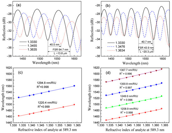 Response to RI changes for different C-type cavity lengths: (a,b) show the response variations in the optical fiber at different environmental liquid refractive indices for L = 13.8 μm and 20.3 μm, respectively; (c,d) illustrate the linear relationship between liquid RI changes and the minimum interference wavelength for L = 13.8 μm and 20.3 μm, respectively [35].
