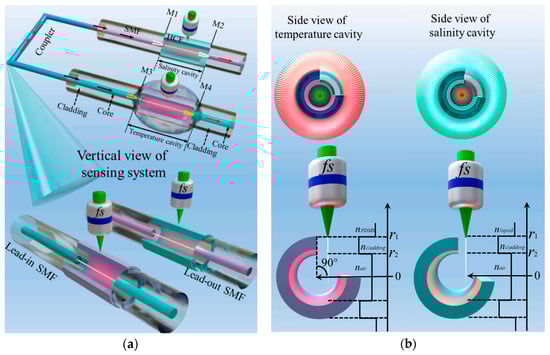 (a) Schematic diagram of the dual C-type optical fiber sensing structure; (b) side view of the salinity cavity and temperature cavity [42].