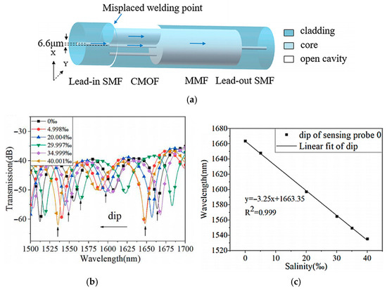 (a) Sensing structure configuration. (b) Spectral response at different salinity levels. (c) Relationship between wavelength shift and salinity at various tilt angles [48].
