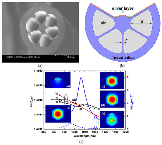 (a) Cross-sectional image of commercial grapefruit fiber; (b) structural diagram of the designed C-type structure PCF-SPR sensor; (c) dispersion relation and electric field distribution of the core mode and SPP mode [67].