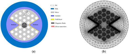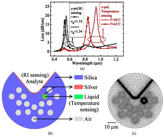(a) Polarization loss spectra in the x and y directions; (b) 2D structure diagram of the proposed sensor; (c) example of a finite element model with a triangular normal mesh for the calculation region [76].