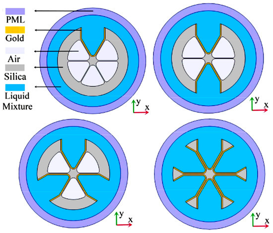 Cross-sectional view of an SPR temperature sensor based on a grapefruit structure with 1, 2, 3, and 6 holes.