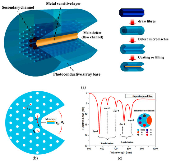 (a) The 3D diagram of the C-type PCF device; (b) 2D structure diagram of the proposed sensor; (c) multi-phase immersion output spectrum [82].
