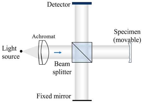 White-light interferometry is a robust technique for high-resolution surface profile measurements. By analyzing the interference pattern acquired in the optical path, precise surface profile measurements can be achieved. In this study, the optical simulation software Virtuallab Fusion (version 7.6.1) was utilized to construct the white-light interference optical path depicted in Figure 1 [30]. The white-light interferometry simulation model implements a Michelson interferometer configuration using a broadband xenon lamp source (400–700 nm spectral range) under controlled environmental conditions (20 °C, 101.33 kPa). An achromatic lens (#49-664, Edmund Optics, Barrington, IL, USA, 2° field of view, with optical parameters detailed in Table 1) [31,32] collimates the light before it encounters a 50:50 non-polarizing beam splitter. The reference arm incorporates a 50 × 50 mm ideal plane mirror with 100% reflectance across the operational spectrum, precisely positioned to maintain a 100 mm optical path length matched to the measurement arm. The measurement path terminates at a test sample modeled as a homogeneous high-reflectance medium with Lambertian scattering characteristics. Interference patterns are captured by a CCD detector featuring a 30 × 30 mm active window with 256 × 256 sampling points, positioned 100 mm from the beam splitter. The simulation accounts for the source’s short coherence length through adaptive step size control during numerical acquisition, enabling precise fringe pattern prediction. This simulated approach establishes a reliable foundation for subsequent experimental implementation.