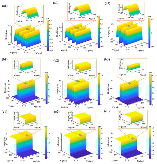 To quantitatively evaluate the surface reconstruction ability of DNN, the Michelson white-light interference model was utilized to measure sin(x), 2Posts, and step surface and generate corresponding interference patterns. The real parameter data of the measured surface is presented in Table 2, with the surface topography depicted in Figure 9a1–a3, respectively. The profiles at x = 0 were compared, as illustrated in Figure 9b1–b3 (the differences between the DNN reconstructed contours and the true contours are adjusted for display purposes). The results indicate a high level of consistency between the reconstructed surface topography profile and the real surface profile. The average height deviations between the reconstructed profiles output by the DNN and the real surface profiles are 0.039 nm, 0.054 nm, and 0.061 nm, respectively, with relative errors below 0.3%. This demonstrates the proficient performance of the DNN in surface topography reconstruction, accurately capturing the details and structures of various surface types.