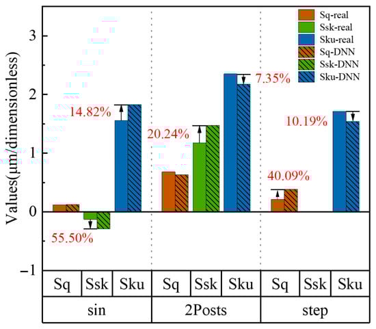 Figure 10 presents a comparative analysis of the topography characteristics of the DNN-reconstructed and real measured surfaces in terms of Sq, Ssk, and Sku parameters. While the Sq parameter shows acceptable deviations for sin and 2Posts surfaces, the DNN-reconstructed Sq value is elevated for the step surface. This might be attributed to overfitting of the model to subtle textural features, resulting in inaccurate quantification. Significant deviations are observed in the Ssk parameter for the sin surface, potentially due to insufficient representation of the highly asymmetric distribution of sin in the training data, hindering accurate reconstruction. For all three surfaces, the deviations in the Sku parameter remain within 15%, considered acceptable. Overall, the DNN method effectively reconstructs topography parameters across various scenarios, exhibiting high accuracy, particularly for complex surfaces, thus validating its efficacy. However, the observed discrepancies highlight avenues for model improvement. Optimizing the training data and model architecture promises further enhancements in reconstruction accuracy.