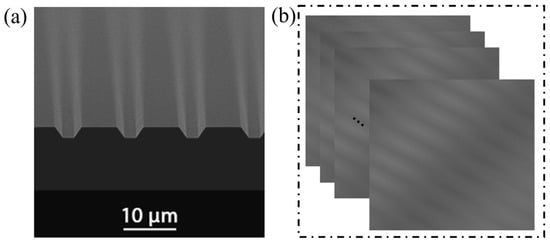 To evaluate the generalization capability of our DNN method in untrained CSI measurements, we tested a standard trapezoidal grating (MikroMasch, TGF11, Wetzlar, Germany; step height: 1.75 μm, pitch: 10 μm, edge angle: 54.74°) as the sample. The SEM image in Figure 12a confirms the sample’s geometry, while Figure 12b shows 200 acquired interferograms serving as DNN inputs. The DNN successfully reconstructed the 3D topography (Figure 13a), exhibiting clear periodic step structures with height distributions (0–1.75 μm) matching expected geometric parameters. The cross-sectional profile at pixel X = 200 (Figure 13b) demonstrates characteristic trapezoidal features, verifying single-pixel reconstruction accuracy. As quantified in Table 3, the proposed DNN achieved superior performance (RMSE: 47.12 nm) compared to conventional methods: the centroid (58.24 nm) and Hilbert transform (64.33 nm) methods showed higher errors due to fringe contrast sensitivity. Fourier transform (FT) (59.13 nm) and spatial frequency domain analysis (FDA) (51.80 nm) exhibited improved but still inferior performance. The DNN’s 9.0% RMSE reduction versus the best conventional method (FDA) demonstrates enhanced noise immunity and generalization. The sub-wavelength accuracy (47.12 nm < λ/8, λ ≈ 550 nm) confirms the method’s capability for high-precision micro/nano-structure metrology, surpassing the λ/4 theoretical limit of conventional interferometry.