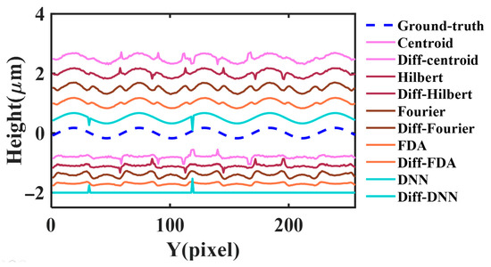 To evaluate the performance of the proposed method in terms of noise resistance, interference images with scattered noise were used as inputs for surface reconstruction. By controlling the level of scattered noise, the performance of the DNN model under different noise conditions was assessed. A sinusoidal surface was measured as the target surface, and the contour at x = 100 was selected for quantitative comparison. Ground-truth represents the actual contour of the target surface (PV is 0.37 μm, pitch is 6.5 μm), Ground-DNN represents the reconstructed contour by the DNN, and Ground-diff-DNN represents the difference between the reconstructed contour and the actual contour. It can be observed from Figure 14 that the increase in scattered noise has little impact on the accuracy of the contour reconstructed by the DNN method, with only a small amount of burrs phenomena. In contrast, the reconstructed contours of the centroid [41], Hilbert transform [42], FT [9,43,44], and FDA [45] methods exhibit deformation and are significantly affected by noise, leading to a noticeable decrease in reconstruction accuracy. In the comparative analysis in Table 4, the measurement accuracy of the centroid, Hilbert transform, FT, and FDA methods decreases with increasing noise levels, while the measurement accuracy of the DNN reconstruction method remains relatively stable. When the noise level is = 0.1, the RMSE of the reconstructed contour using the DNN method is only 43.89 nm. Therefore, the proposed surface reconstruction method demonstrates superior noise resistance compared to traditional methods, which is of great significance for achieving high-precision surface reconstruction and widespread practical engineering applications.