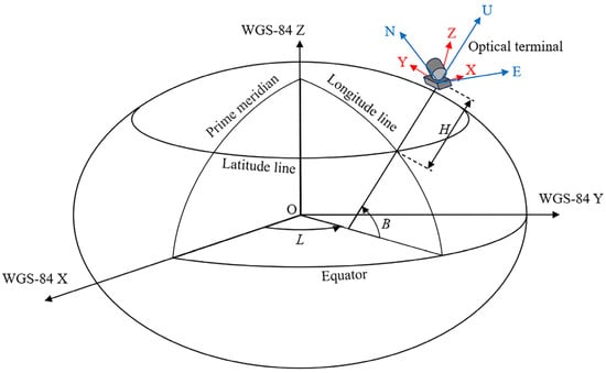 Let and denote the WGS-84 coordinates of the target and optical terminal, respectively. The pointing vector in the WGS-84 coordinate system is expressed as