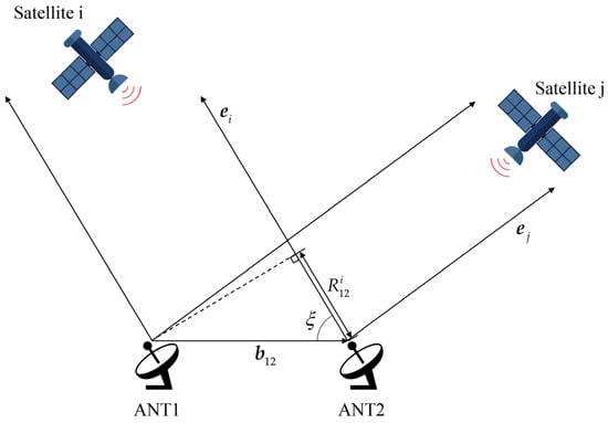 Due to the limited stability of internal quartz crystal oscillators in GNSS receivers, the clock bias between two receivers is challenging to directly resolve. To enhance precision and mitigate clock bias, a double-difference model is adopted by combining two single-difference measurements between stations and satellites. When ANT1 and ANT2 receive signals from the satellites i and j simultaneously, the double-difference carrier phase observable is formulated as