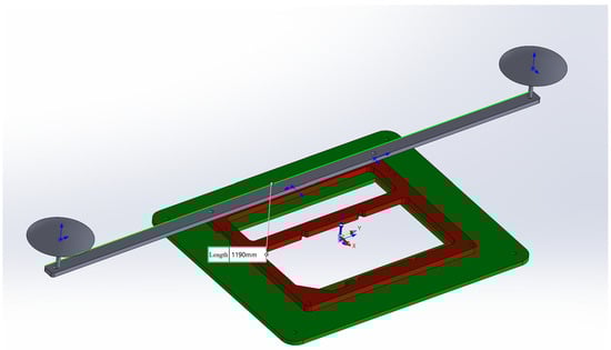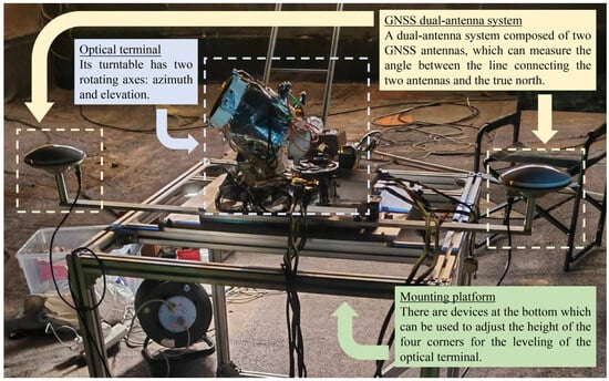 In this experiment, the optical terminal at the ground station was mounted on a relay adapter plate, which was connected to a mounting platform with attitude adjustment capabilities. A digital inclinometer was used to precisely adjust the platform’s attitude until a horizontal state was achieved. Following horizontal alignment, a GNSS dual-antenna system was installed on an extension rod parallel to the pitch rotation axis of the relay adapter plate. The extension rod, approximately 1.2 m in length, was machined to ensure strict parallelism with the adapter plate, which meant that the deviation angle between the baseline and the turntable zero position was a right angle. The installation schematic is shown in Figure 10. The deviation angle between the baseline and the turntable zero position was set to 90° or −90°, because during tooling production, the rectangular base plate of the optical terminal was designed to align with the GNSS extension rod, and at the same time, the zero position of the optical terminal was set parallel to the edge of the rectangular base plate of the optical terminal. The positive and negative are determined by the relative positions of the GNSS master and slave antennas. Even if this design may cause a certain error in the azimuth of the turntable, it can be corrected through stellar calibration.