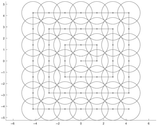 From Equation (17), the uncertainty region size caused by systematic errors is calculated as . Scanning methods for optical terminals, such as spiral scans and raster scans, inherently utilize the beacon light’s narrow divergence angle to cover all positions within the uncertainty region, thereby identifying the pointing direction where the beacon light can be captured. The differences among scanning methods lie in the ease of turntable trajectory implementation and whether the scan progresses from high-probability to low-probability regions to save time. The beacon light divergence angle in optical communication is typically small; in this experiment, the divergence angle is 800 μrad (0.046°). Taking the rectangular spiral scan illustrated in Figure 4 as an example, to ensure full coverage of the scanning range, the step size should be less than or equal to times the divergence angle. When the uncertainty region spans 1.26°, performing a rectangular spiral scan over this region requires over 1500 steps. Assuming a dwell time of 1 s per step to determine whether the beacon light is captured, the total scanning duration would reach 25 min. In practical scenarios, environmental factors may further enlarge the uncertainty region, leading to even longer scanning times. Under dynamic conditions, long-term scanning will cause the optical terminal to have a significant relative movement with the carrier, resulting in continuous degradation of the theoretical pointing accuracy, expansion of the uncertainty region, and ultimately, failure to establish a link.