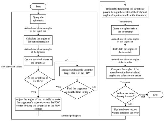 To address the loss of theoretical pointing accuracy caused by an excessive scanning time during initial alignment, this study proposes an iterative stellar calibration method based on the experimental optical terminal. This method utilizes the FOV to capture visible stars and corrects the turntable’s pointing errors by referencing stellar positions from ephemeris data, thereby reducing the uncertainty region, shortening the scanning time, and enabling rapid link establishment. The workflow is illustrated in Figure 5.