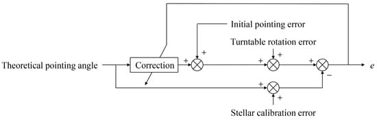 During error correction, turntable telemetry data is analyzed to identify the timestamp when the star traverses the FOV centroid, recording the corresponding input angles (, ). Theoretical angles (, ) at that instant are recalculated using Equations (18) and (19). Here, it can be known that the calculation formulas of (, ) and (, ) are the same. The only difference lies in the time. The time of (, ) is before the stellar calibration, while the time of (, ) strictly corresponds to (, ). Correction values are then updated iteratively via