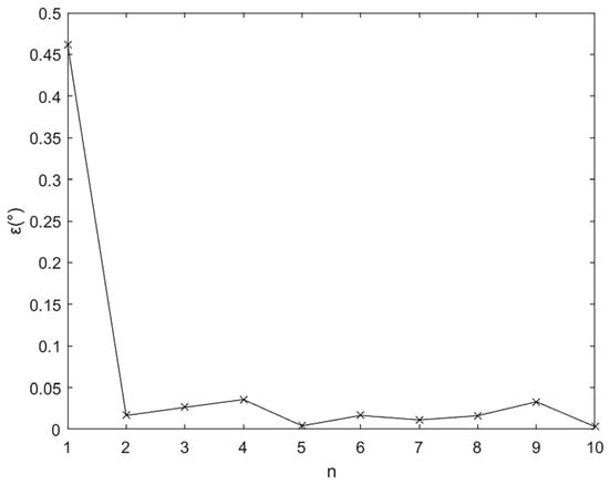 A simulation of the residual error generated by the stellar calibration process was conducted. The simulation results are shown in Figure 7. It can be observed that after the first stellar calibration, the system’s residual error plummets rapidly. In subsequent calibration processes, the residual error is stably below 0.05°.