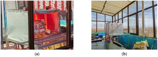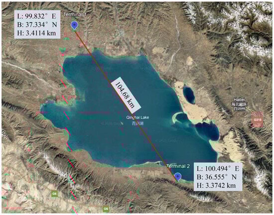 A field experiment was conducted at two sites separated by 104.68 km across Qinghai Lake, with their geographical coordinates listed in Table 1. The appearances of Terminal 1 and the experimental environment are shown in Figure 8, respectively. The relative positions of the two sites are illustrated in Figure 9. In this experiment, the transmitting wavelength of Terminal 1 is 1540 nm, and the receiving wavelength is 1556 nm. The wavelength band of the coarse tracking camera is 800 nm, and that of the fine tracking camera is 1550 nm. The antenna aperture is 100 mm. For Terminal 2, the transmitting wavelength is 1550 nm, the receiving wavelength is 1540 nm, and the FOV of acquisition can reach 4°. The transmission rate is 100 Gbps. Terminal 1 transmits 800 μrad (0.046°) signal light for scanning, and Terminal 2 is the companion terminal responsible for staring and receiving.