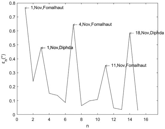 The experimental results are illustrated in Table 2 and Figure 11. Data points annotated with “Date, Month, Target Star” (e.g., “1, Nov, Fomalhaut” represents up to the next annotated point, obtained through successive iterations since the experimental time of November 1st, observing Fomalhaut) indicate instances where external disturbances (e.g., optical terminal is moved or reinstalled) occurred prior to the iteration. The HIP (Hipparcos Catalogue) is a star catalogue published by the European Space Agency using measurement data from the Hipparcos astrometric satellite. In Table 2, “HIP” represents the star’s identifier in the Hipparcos Catalogue. The results demonstrate that, in the absence of such disturbances, the system achieves rapid residual reduction within 1–2 iterations. This satisfies the stringent requirements for high-precision laser communication link establishment.